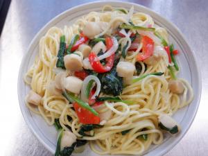 今回の料理は帆立とほうれん草のスパゲッティです。野菜もたっぷり食べましょう!
