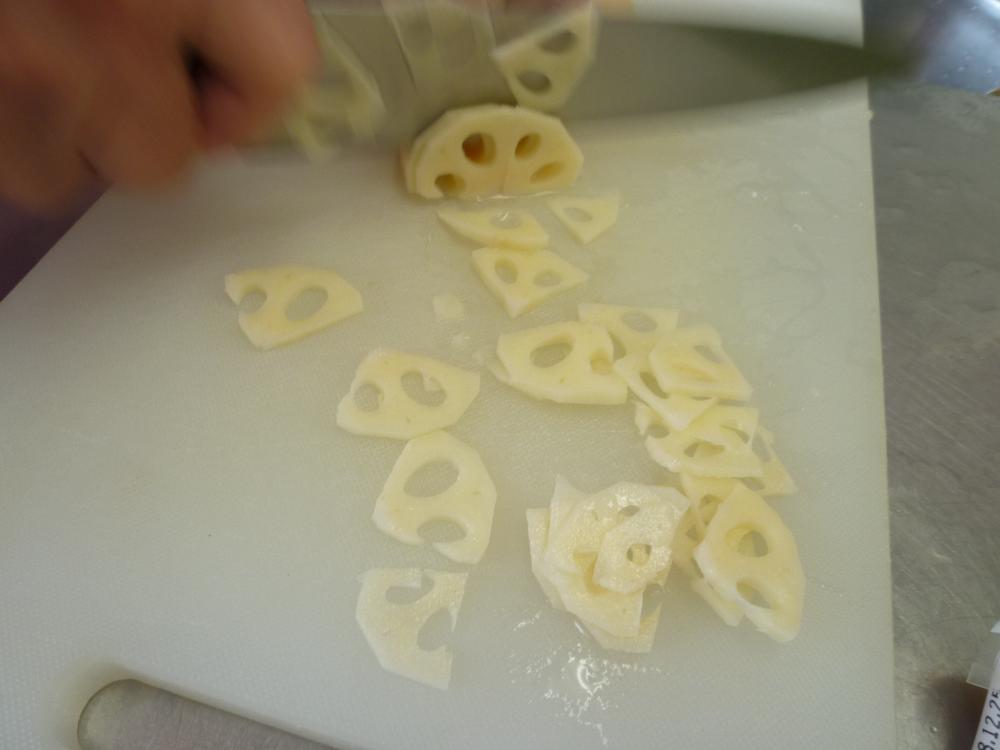 1、ソーセージは斜め薄切りにする。レンコンは皮をむいて薄めのいちょう切りにし、さっと水に放す。ニンジンもいちょう切りにする。