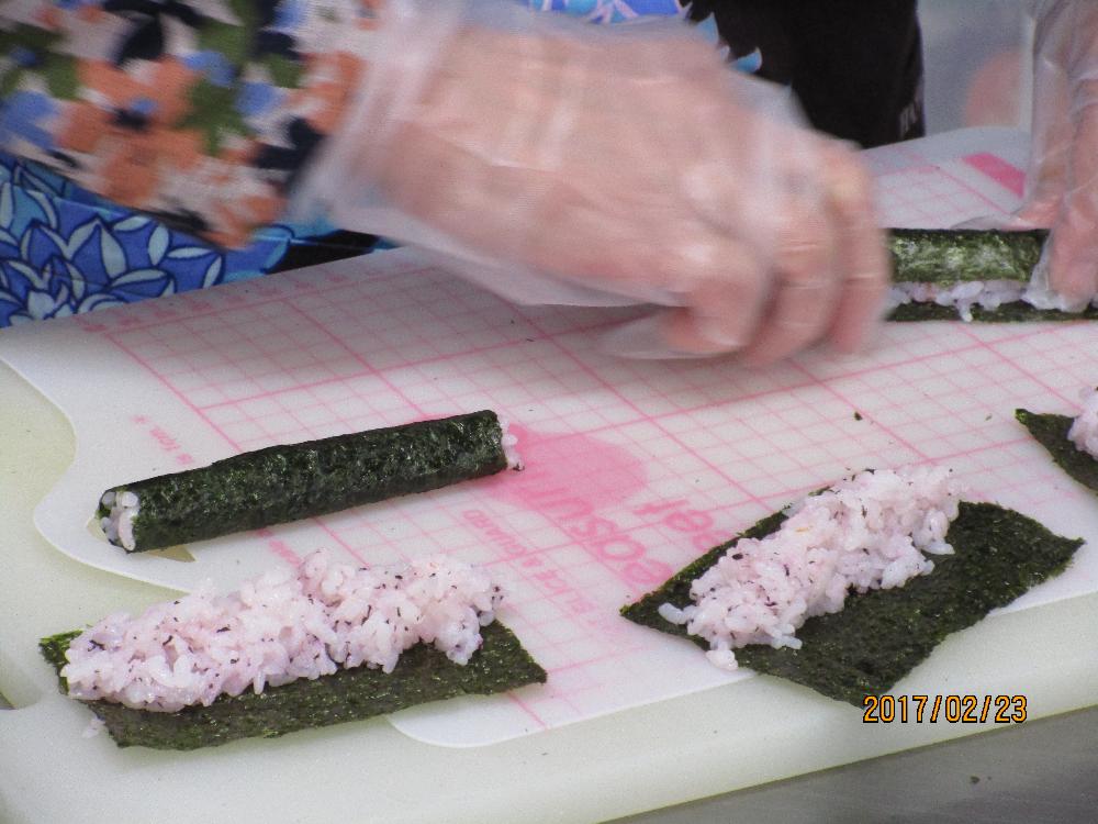 色を付けた寿司飯を焼き海苔(半切を1/3に切ったもの)で巻いていく。