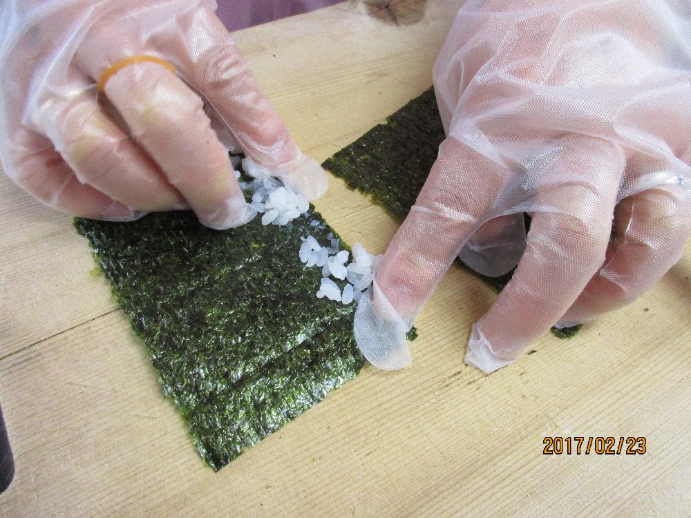 6、焼き海苔(半切)1枚と1/3に切ったものをつなげる。