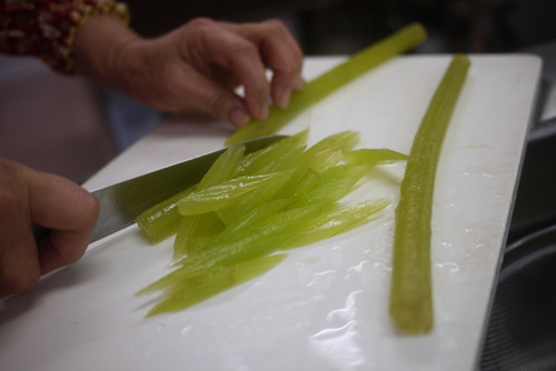 冷水にとって皮をむき、5〜6センチ長さの斜め切りにする。