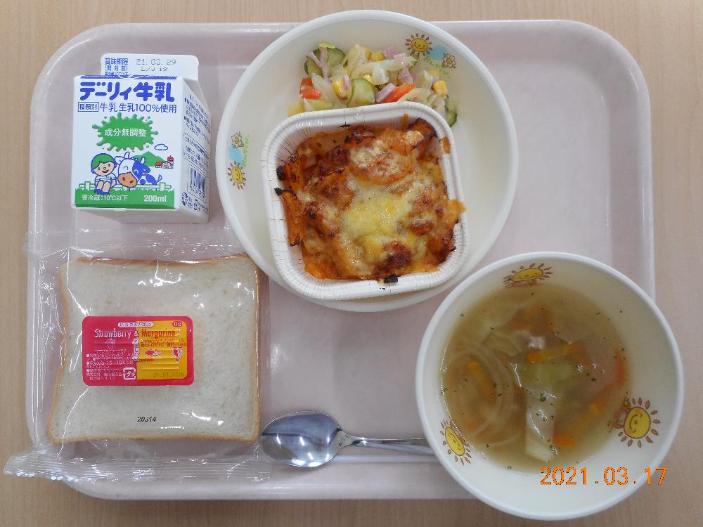 食パン いちご&マーガリン ポテトミートグラタン コーンサラダ 野菜スープ 牛乳