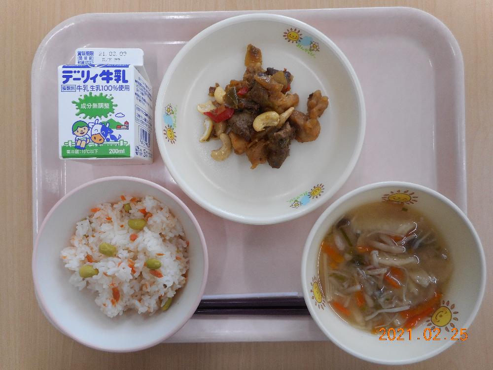 鮭枝豆ごはん 鶏とレバーとナッツの揚げ煮 せんべい汁 牛乳