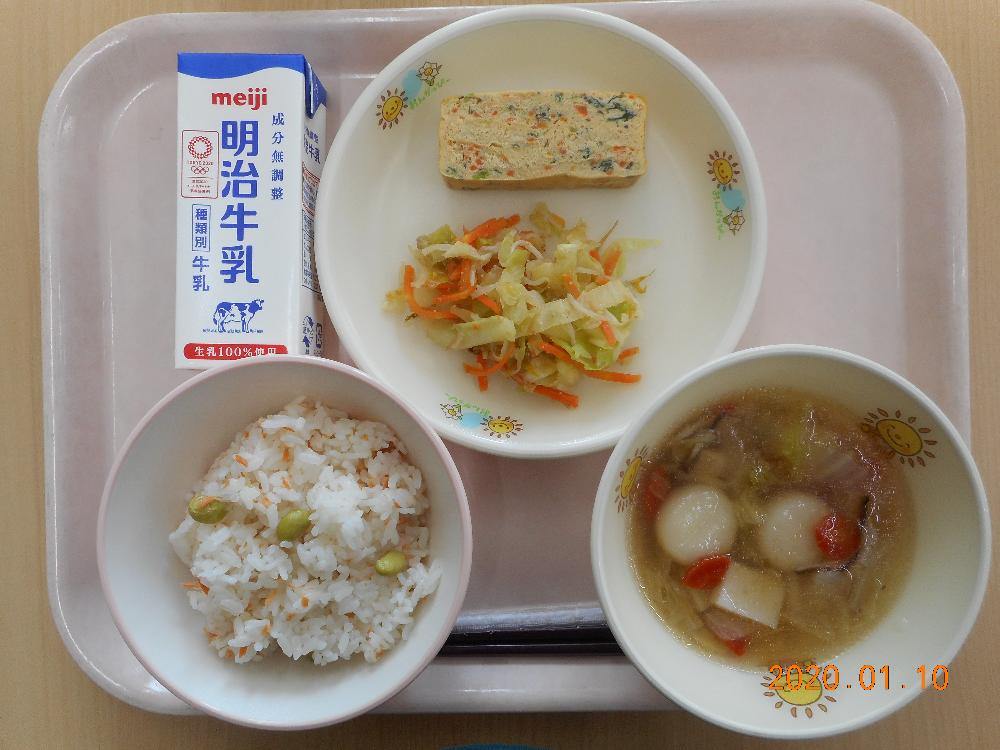 鮭枝豆ご飯 卵焼き ごま和え 雑煮 牛乳