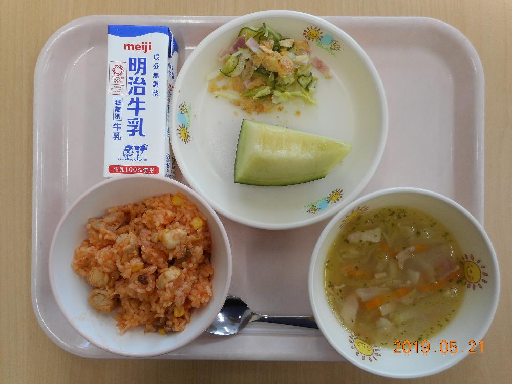 チキンライス チップスサラダ ベーコンとキャベツのスープ メロン 牛乳