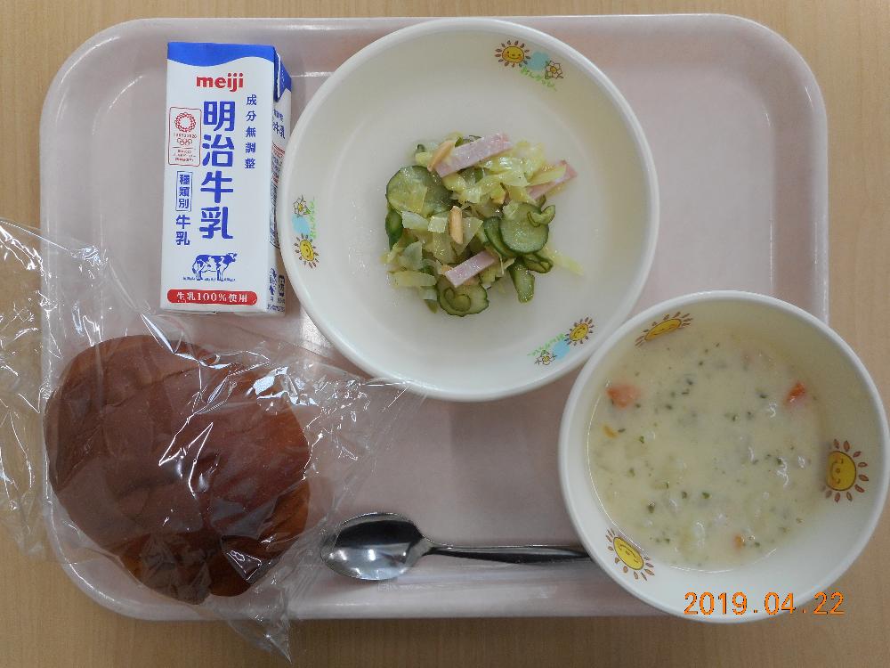 ミルクロールパン クリームシチュー アーモンドサラダ 牛乳